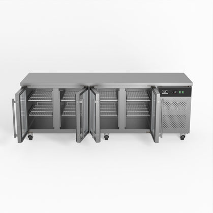 This new X-series model is created with the busy kitchen in mind, perfect for pubs, restaurants, and bars. It features four double-glazed glass doors, which are all equipped with self-closing mechanisms, designed to save you time and concurrently provide higher efficiency in cooling and overall energy usage, saving you time and money. As standard, this fridge is fitted with heavy-duty castor wheels for easy placement at your premises. The high-grade stainless steel and insulation used in the construction allow the unit to withstand an ambient temperature of 43°C. With considerations for the purpose to maximise usage of its 553L capacity, centre shelf connectors are included. A DIXELL LED controller is fitted with a ZEL compressor providing automatic defrost and specifically designed dual fan-forced ventilated cooling.