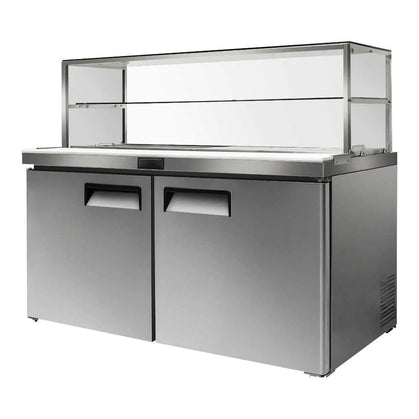 This two-door sandwich bar is a versatile and space-saving device that takes up the least possible space in the kitchen. This is a refrigerator that provides you with ample space to store and display your ingredients while also preserving your food at the ideal temperature. The glass canopy of the 2 Door Sandwich bar fridge provides excellent visibility while remaining energy efficient. With 2 shelves of 40kg loading capacity each and 16 GN1/6 trays, this refrigerator is perfect for your busy establishment.