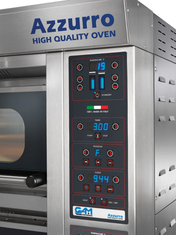 Azzurro is a professional pizza deck oven series that has been designed around the needs of the modern pizza baker who has limited working space but large production demands thansk to the upwards opening door that allows shorter shovel work. They are completley modular and can be stacked up to 3 units high. As a professional oven, the azzurro series comes complete with a full suite of addiional options. The Azzurro 9 is distinguished by its 9 pizza capacity.
