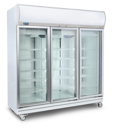 Bromic 1507L 1GD1500LF Flat Glass 3 Door LED Upright Display Chiller has a sleek and sturdy design that draws customers' attention while preserving the quality of stored food items. The self-closing door allows for easy stocking and hassle-free service. This piece of equipment is also more energy-efficient because of the double-glazed heated safety glass. Temperature range for this machine is from +2°C to +8°C. Units may also be decaled to suit your promotional or business needs.