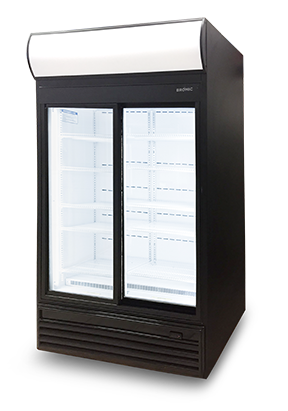 Bromic 945L GM0980LS-NR Sliding Glass Door Upright Display Fridge with Lightbox offers reliability in a stylish black casing and is suited ideally to self-service retail applications.