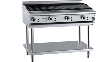 The B+S Black Char Broiler is mounted on an open stand with an undershelf ideal for storing cooking utensils. The cooking surface consists of heavy-duty cast iron grates with special drainage channels, which direct fat to the fat spillage tray located at the front of the unit. A cast-iron hood placed above the 33Mj burners radiates heat evenly across the grates, creating an ideal surface for grilling.