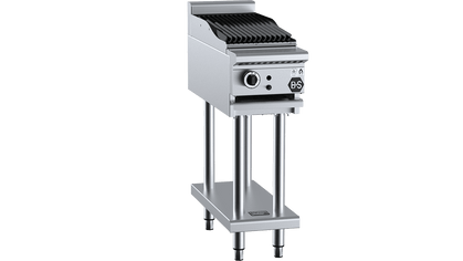 The B+S Black Char Broiler is mounted on an open stand with an undershelf ideal for storing cooking utensils. The cooking surface consists of heavy-duty cast iron grates with special drainage channels, which direct fat to the fat spillage tray located at the front of the unit. A cast-iron hood placed above the 33Mj burners radiates heat evenly across the grates, creating an ideal surface for grilling.