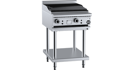 The B+S Black Char Broiler is mounted on an open stand with an undershelf ideal for storing cooking utensils. The cooking surface consists of heavy-duty cast iron grates with special drainage channels, which direct fat to the fat spillage tray located at the front of the unit. A cast-iron hood placed above the 33Mj burners radiates heat evenly across the grates, creating an ideal surface for grilling.