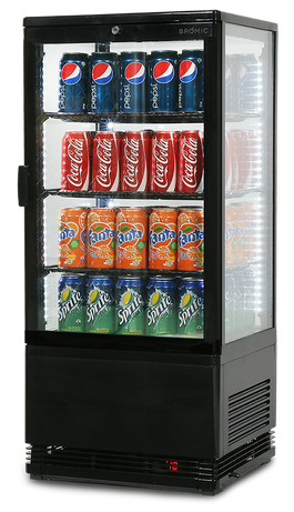 Bromic's CT0080G4B Flat Glass 78L LED Countertop Beverage Chiller perfectly combines display and cold storage functions all in one. Thanks to purpose-designed ventilation guards and a highly efficient fan-forced motor, the cabinet is cooled evenly. This mechanism ensures that soda, water, juice, and all other beverages for sale are chilled to perfection. This versatile chiller can easily be mounted on any flat space.