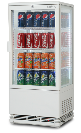Bromic's CT0080G4W Flat Glass 78L LED Countertop Beverage Chiller is a specially designed cooling and display unit. 4-side LED lighting that spotlights stored beverage products from all angles. Adjustable steel shelving with corrosion-resistant coating allows for easy access and keeps rust at bay to maintain product quality. Ventilation guards ensure that the cold is contained within the chiller. Fan-forced cooling keeps a variety of drinks perfectly chilled for customers.