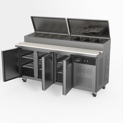 Equipped with castor wheels for easy manoeuvrability and constructed from heavy-duty stainless steel, the saladette worktop fridge is designed for busy commercial environments such as cafes, restaurants, pubs, and sandwich shops. With a 30cm deep preparation bench, self-closing doors on the fridge storage space and shelving rails suitable for 1/1 GN and 1/3 GN trays, this unit is designed to keep food products fresh and accessible during the meal-time rush. This unit is built with a Cubigel or ZEL compressor and an automated defrosting system, complemented by CAREL digital controller with LED temperature displays.