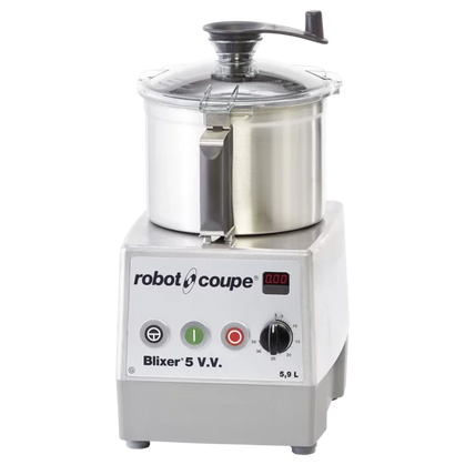 Blixer® 5 V.V. Single-phase 220-240V/50/1. Power: 1500 W. Variable speed: 300 - 3500 rpm. 5.9-l stainless-steel bowl with handle, plus bowl-base, fine-serrated, twin-blade assembly. Totally leakproof lid with scraper arm. 3 - 20 portions (200 g).