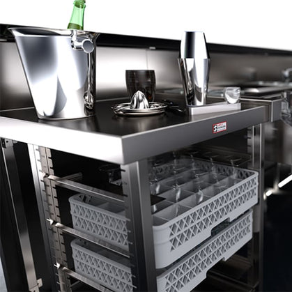 The Simply Stainless Single Bar Module with Basket Rack is designed to accompany the Simply Stainless 600 Series Single Bar Bench Modules. The unit features a glass/dishwasher basket rack below.