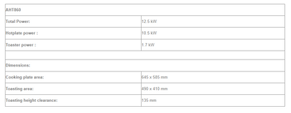 12mm thick heavy duty machined steel hot plate, separate controls for left and right side of hot plate, each side has cook/idle switch, each cook/idle switch has it's own thermostat, twin digital temperature display depicting plate temperature, dedicated element for grilling & grill has cook/idle switch. 645 x 585mm cooking plate. Castors on the rear and adjustable legs at the front.