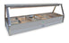 Double row hot food display bar, stainless steel construction with tubular frames, energy regulator control, Dura life stainless steel elements, wet or dry operation, easy to clean, overhead heating and illumination, safety lock ball valve drain, removable cross bars & thermometer. Comes with 12 x 1/2 size 65mm pans.54lt