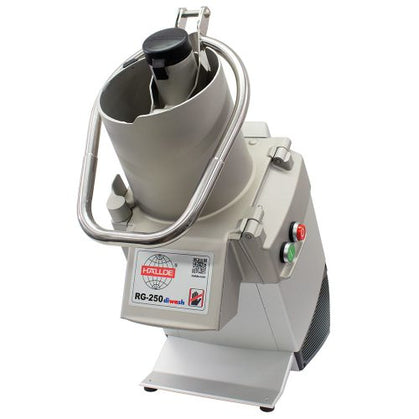High Volume Veg Prep machine with 50 different cuts possible. Slice, crimp, julienne, shred/grate, dice & potato chip. 1000 portions /day, 10kg/min. Full moon shaped feed head with ergo loop handle for easy leveraged feeding, ergonomic leaning design. The “RG-250 diwash” has all the same great features of the RG-250 with the added benefit that all removable parts in contact with food are dishwasher safe. The diwash parts, in food-zones, have a smooth surface resulting in minimal friction. All removable parts of the RG-250 diwash have an organic polymer coating and are dishwasher safe.