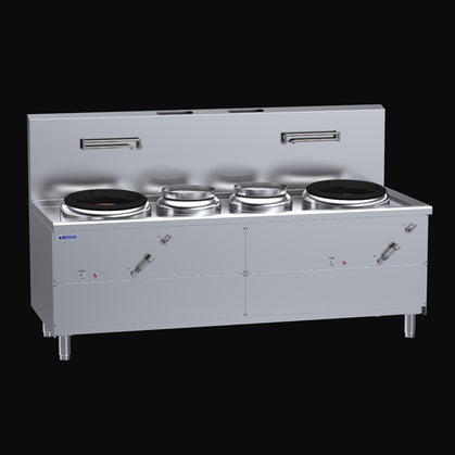 Inspired by the fast-paced kitchens of Hong Kong, 'Fo San' is cantonese for volcano, representing the raw heat and power generated by the unique burner set-up. The WV-1A2P1A double hole wok comes with two fan forced stainless steel 145MJ air-blast burners and two centre pots, electronic ignition, external pilot, rear flue system and pre-cast fire-brick combustion chamber