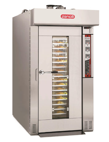 The Rotor Wind is a rotating convection oven that is designed for the high production needs of the bakery and pastry sector. They come in various models from 8 to 36 trays of simultaneous cooking using (40×60 cm) trays. With its rotating trolley that can be rapidly unloaded and loaded to meet production needs, the Rotor Wind can be powered by gas, fuel oil or electricity. The Rotor Wind is a part of Zanolli's origin, known and appreciated across the world. The simple and intuitive electromechanical controls allow complete control of all parameters including set temperature using a digital thermoregulator, activate the ventilation, activate the carriage rotation, activate the steam extractor, set the steaming, activate the end of cooking timer (high volume buzzer, active until manual switch-off) and control the interior lighting. In this gas-powered version, the heat exchanger is made of special steel and achieves remarkable efficiency with significant energy savings. In addition to the traditional version with front burner, it is also produced in versions with rear burner (suitable for long and narrow rooms). The Rotor Wind 5GL is a double rack oven and is distinguished by its 36 tray (400 x 600) or 18 tray (600 x 800) roll in trolly capacity and rear burner configuration.