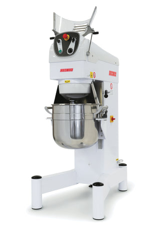 Selene planetary mixers will perform all necessary mixing requirements from frothy egg whites whipped into stiff peaks, compact and crumbly shortcrust pastry, smooth and homogeneous doughs, all thanks to the planetary motion of the chosen utensil. Available in 4 sizes, 40, 60, 80 and 120 and in two configurations: 3 speed or variable. The control panel, located on the head of the machine, is equipped with intuitive and easy-to-use controls and come standard with a timer. The shafts rotate on ball bearings which are resistant to any type of stress. The machine is solid and robust and rests on four anti-vibration rubber feet that guarantee stability and silence. A fine-wire whisk, spatula and hook are just a few of the tools you can use with Selene; the stainless-steel bowl, which comes as standard with all models, guarantees high performance and great durability. The Selene 40 VAR is distinguished by its 40 litre bowl capacity and its variable speed operation.