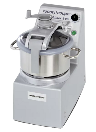 Blixer 8 V.V. Single phase. Power 2200 W. Variable speed: 300 – 3,500 rpm. Pulse function. 8 L stainless steel bowl with 2 handles. Bowl-base blade assembly with 2 detachable fine serrated blades included. Scraper arm and lid wiper included. 5 to 25 portions and more.