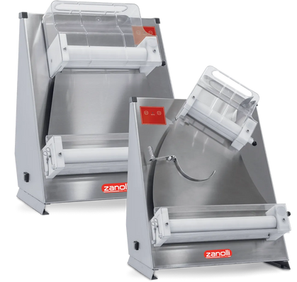 Zanolli rollers will roll cold dough to perfection in round or square dough sheets. Available in a large range of sizes in both parallel and angled models. The Roller forming machine with oblique rollers is designed precisely to obtain the classic rounded shape of the pizza. The movable arm accompanies and rotates the dough in the direction of the second roller. The Roller with parallel rollers are instead designed for the application of the pizza dough in the pan. Time savings and excellent results are guaranteed. They are durable and reliable and include bottom stainless-steel guards and a complete reinforced chassis. Foot pedal operation is standard. The Roller 30 O is distinguished by its 30cm angled double roller.